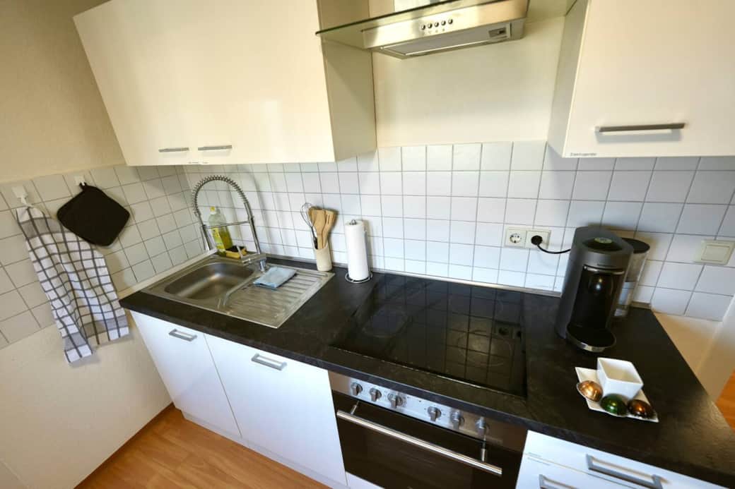 → Voll ausgestattete Küche mit Spülmaschine, Herd, Backofen etc.